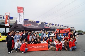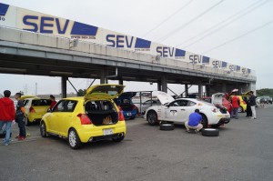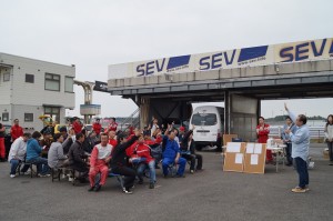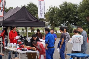 スタッフ始め、お客様も筑波TC1000にこの時間帯に集まるのに交通状況が読めず、遅刻者もいらっしゃいました。スタッフも集まってしまえばお手の物、迷い無くパドック割りや受付設営を瞬く間に終わらせて参加者を迎える事が出来き全員集まって頂け受付も完了! 安全確認の車検を終えてドライバーズミーティングです。