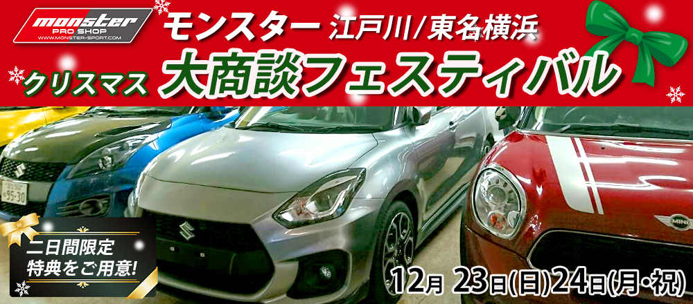 2018年12月22日(土)~24(月・祝)の3日間、モンスター江戸川では「クリスマス大商談フェスティバル」を開催します!お得な商品や特典をご用意して、皆さまのお越しをお待ちしております。【スズキ車・中古コンプリートカーほか、特別販売】 ※商品には限りがございます。品切れの場合はご容赦ください [ご成約特典]さらに! 新車コンプリート車両をお買い上げの方に3つのアイテムをプレゼント!!・カーナビゲーション ・ドライブレコーダー ・モンスターチューニングステッカー ※カーナビゲーション、ドライブレコーダー、ステッカーの内容はこちらで指定させていただきます。