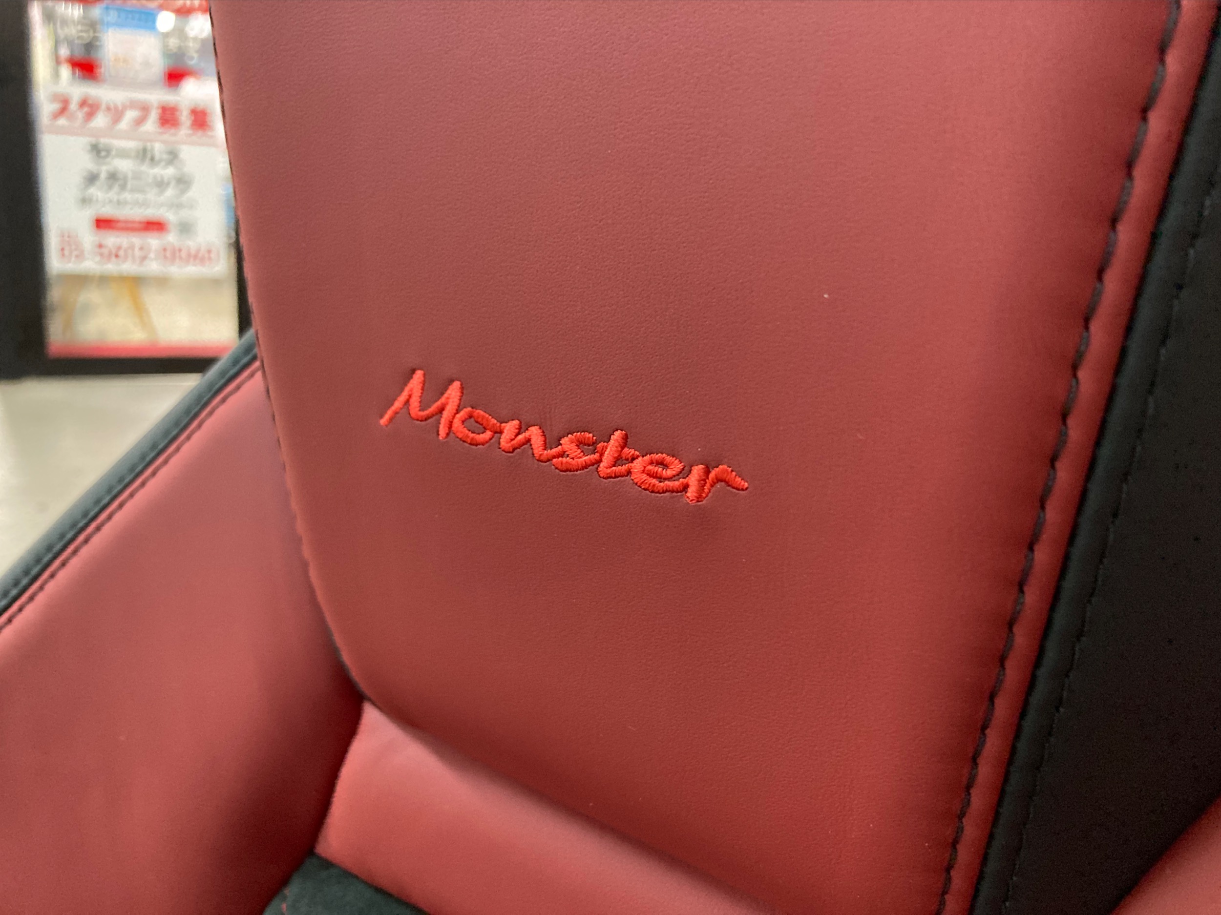 モンスター江戸川完全ORIGINAL!!   当店にて作製したオリジナル本革シートをバーニングレッドパール/ブラック2トーンの車両に装着しました!!   ご覧くださいこのデザインを …