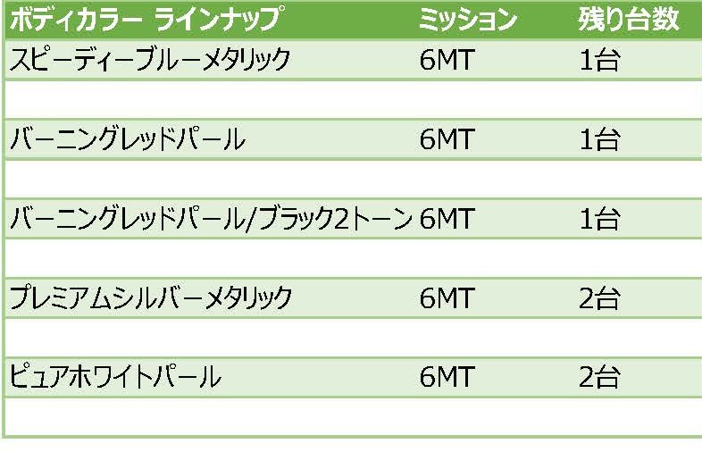 ボディカラー・残り台数の詳細を表にまとめましたので是非ご覧下さい。