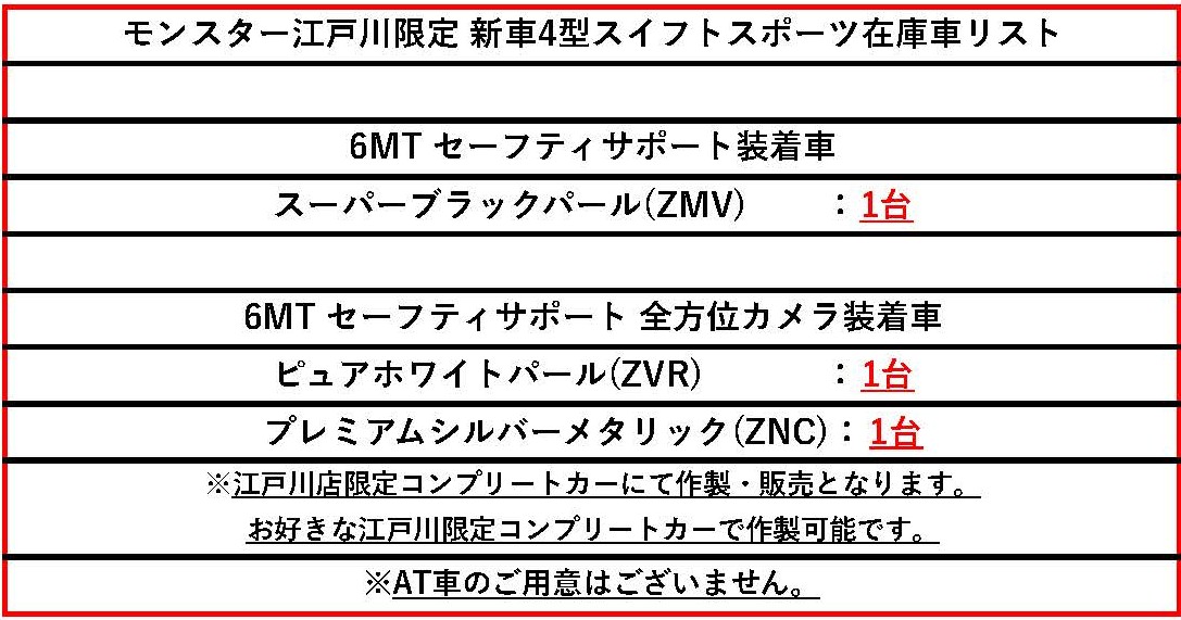 ※4型スイフトスポーツの在庫車は江戸川店限定コンプリートカーでの販売に限ります。
