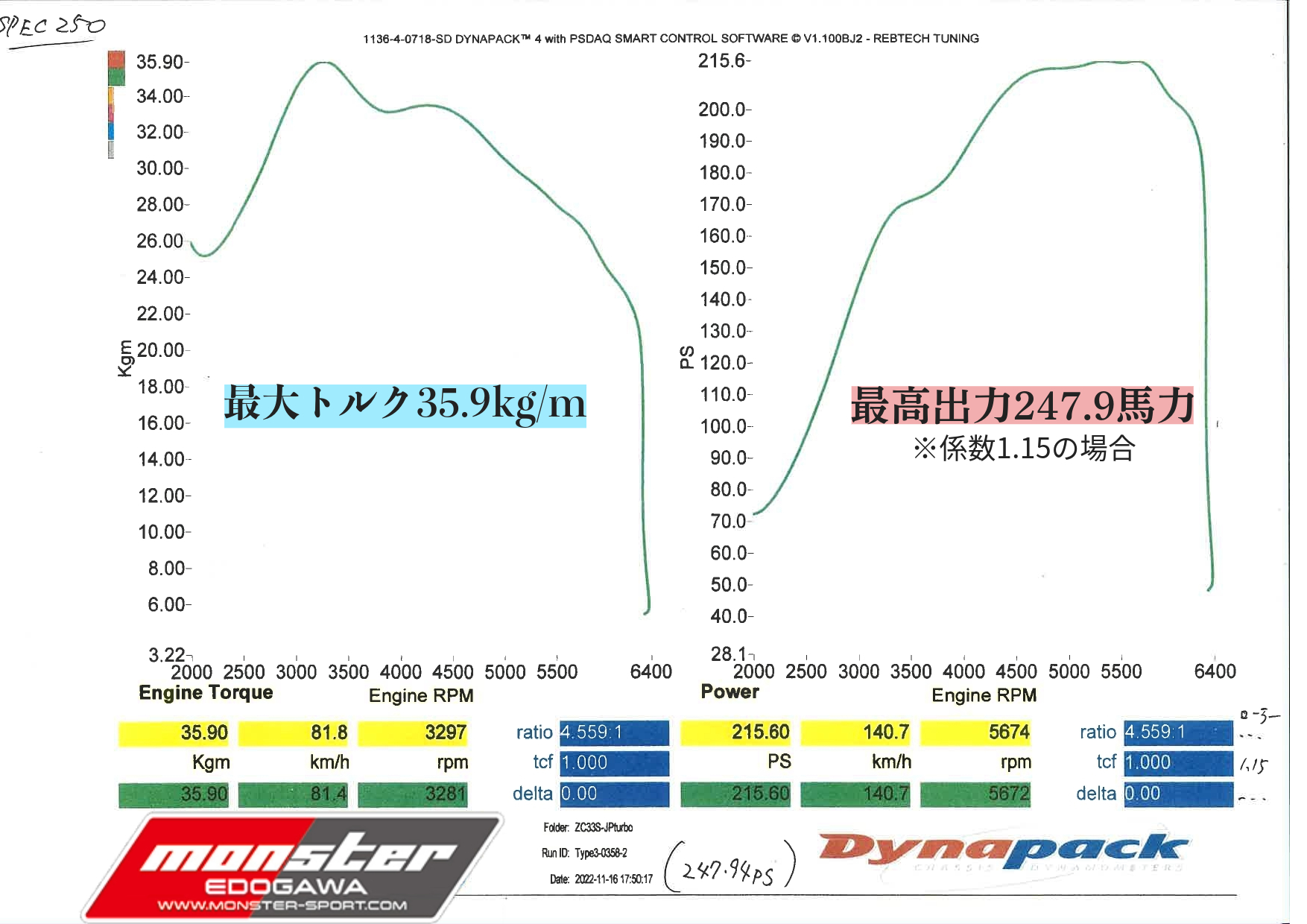 最大出力:247.9馬力最大(ブースト1.5kg固定)・最大トルク35.9kg/m』