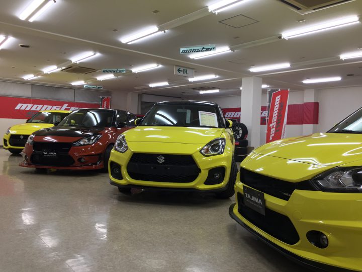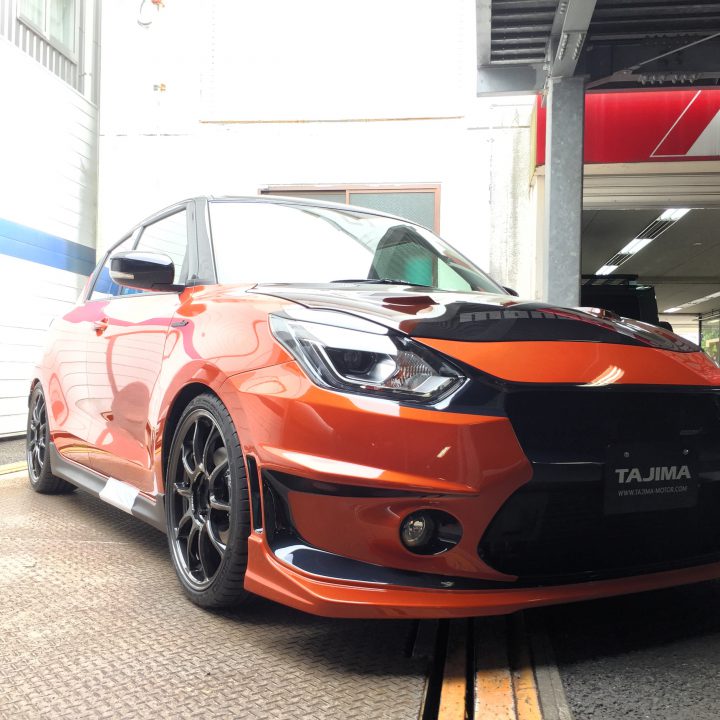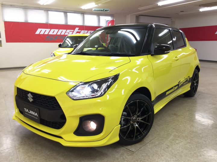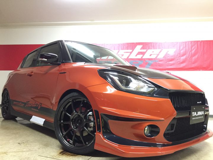 先日に続き、NEWスイフト・デモカーの紹介です。 作業内容 ・モンスターオリジナル車高調 ・社外18インチ・タイヤ アルミホイール オレンジボディにモンスターフルバンパー …