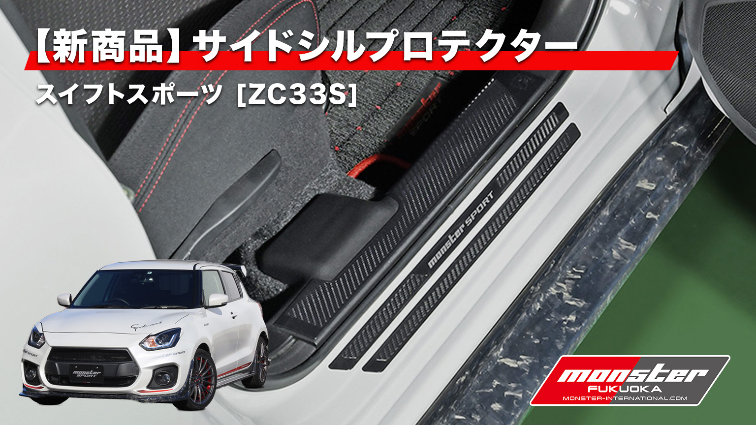 MONSTER SPORT(モンスタースポーツ)より、 スズキ・スイフトスポーツ(型式 ZC33S)用の専用アクセサリー「サイドシルプロテクター」が新登場。乗降車時の接触によるサイドシル周辺のキズを防止に加え、カーボン調デザインとMONSTERロゴでスポーティな印象も演出します。