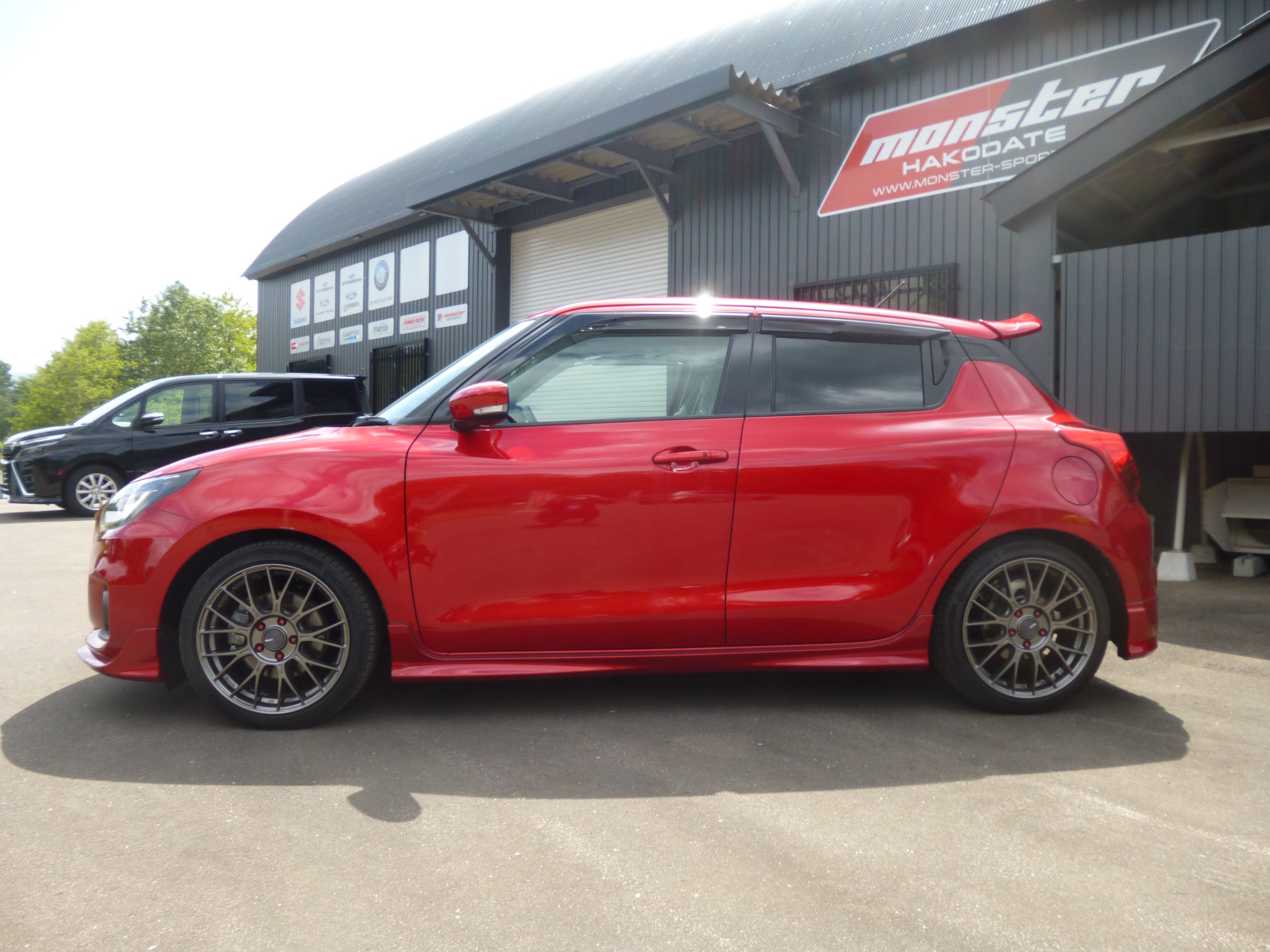ZC33Sスイフトスポーツに純正エアロパーツ、モンスターダックテールを取付し車高調とENKEIのAWでオリジナリティにあふれとてもカッコよく仕上がりました!!