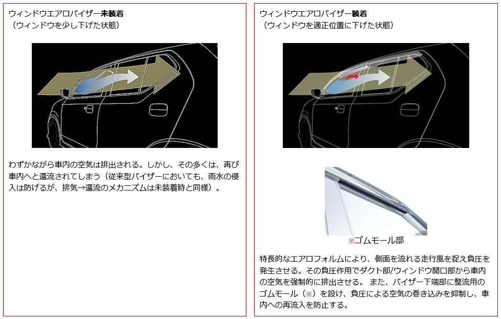 走行風を利用し、バイザーのエアロ効果で負圧を発生させる事で、車室内の空気を積極的に排出させます。バイザー本体に整流用のゴムモールを設け、一度外に出た空気が、再度室内へ戻る事を防止します。
