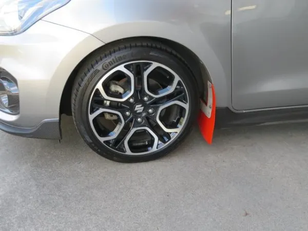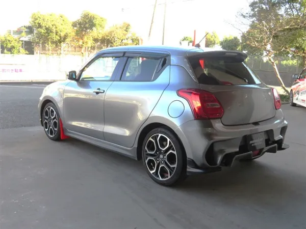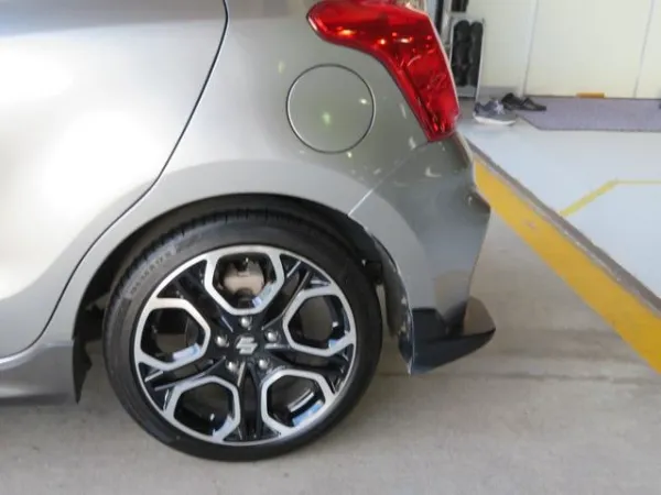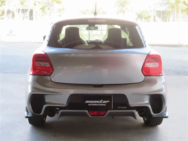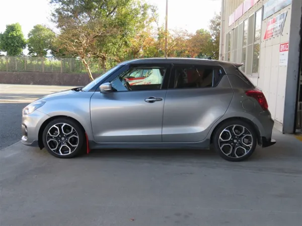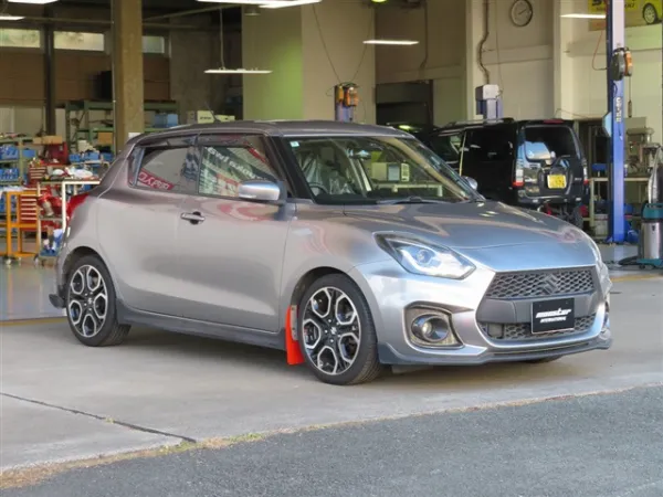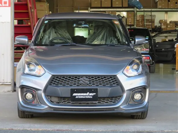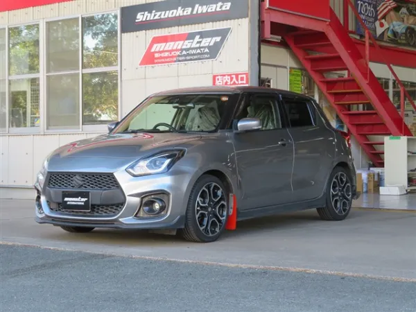 プレミアムシルバーメタリックのボディをベースに、モンスタースポーツ製パーツを多数装着したスイフトスポーツ。リヤバンパーやマッドフラップ、ウインドバイザー、フォグカバーなどが組み合わされ、ノーマルとは一線を画す引き締まった外観に仕上がっています。30mmダウンスプリングの装着により、車高とスタンスのバランスも整えられ、走行性能を意識した佇まいが印象的です。スポーティさを強調しつつ、全体としてまとまりのある外装構成となっています。