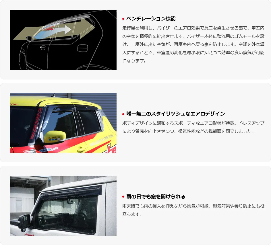 MONSTER SPORTのウィンドウエアロバイザーは、走行風を利用して負圧を生み出し、車内の空気を効率よく排出するエアロ設計となっていて、 整流用ゴムモールにより空気の再流入も防止し、外気導入時も車室温の変化を抑えながら快適な換気を実現できます。