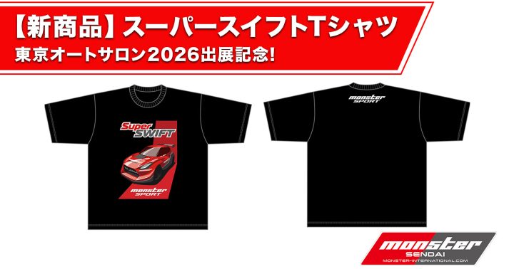 MONSTER SPORTより、東京オートサロン2026出展を記念して「ZC33S スーパースイフトファイナル」オリジナルTシャツが登場!胸元のスケッチデザインと背面ロゴが特徴のビッグシルエットTシャツです。
