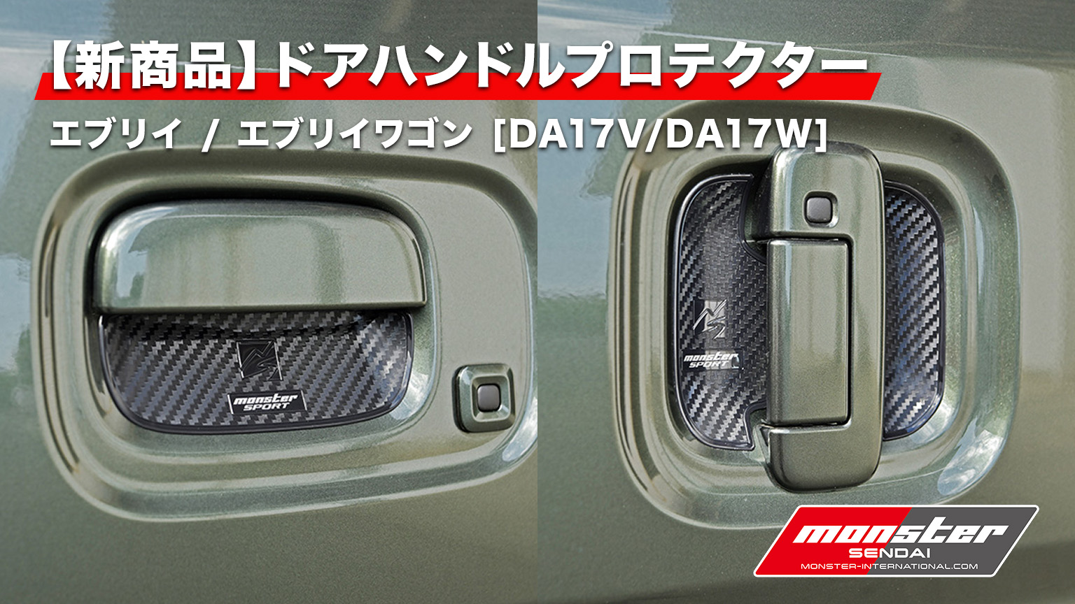 MONSTER SPORT(モンスタースポーツ)より、 スズキ・エブリイ/エブリイワゴン(型式 DA17V/DA17W)用の専用アクセサリー「ドアハンドルプロテクター」が新登場。ドアハンドル周辺のキズ・汚れ対策に加え、カーボン調デザインとMONSTERロゴでスポーティな印象も演出します。